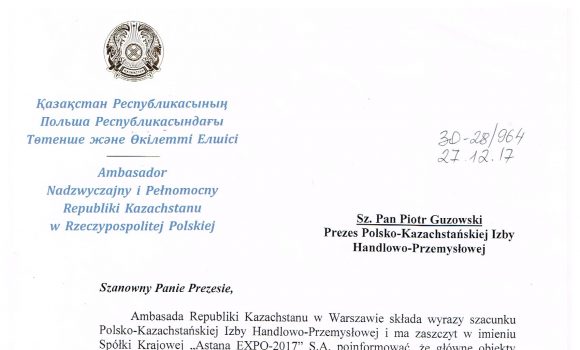 Құрметті Қазақстандықтар, Сіздерді Қазақстан Республикасының әр азаматы үшін айтулы-Тәуелсіздік күнімен құттықтаймыз! Қазақстан мемлекетінің мәртебесі биіктеп, әлемге шарықтай беруіне деген ыстық ықыласымызды жеткізе отырып, әр қазақстандық жанұяға табыс, береке, тыныштық, молшылық тілейміз! Қазақстан-Польша Сауда-Өнеркәсіп Палатасының атынан Петр Гузовски Дорогие Друзья, от всей души поздравляем Вас с одним из главных праздников страны- Днем Независимости Республики Казахстан! Желаем каждому дому и каждой семье…